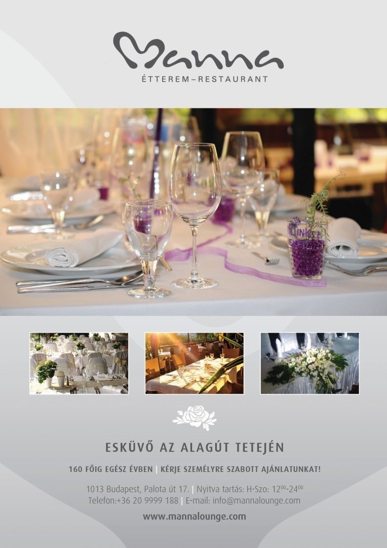 A Manna étterem különleges és emlékezetes helyszíne lehet céges partyknak, esküvőknek, sajtótájékoztatóknak vagy akár divatbemutatóknak is. Az étterem adottságai (elhelyezkedése, befogadóképessége) lehetővé teszik, hogy a megrendelő egyedi igényei szerint alakítsuk át, illetve rendezzük be a teret.